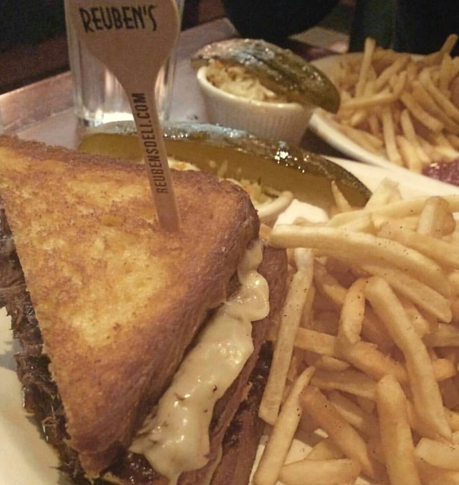 Deux galettes de boeuf haché, garni doignons frits, fromage suisse fondu et la sauce secrète de ReubensMD. 23.99