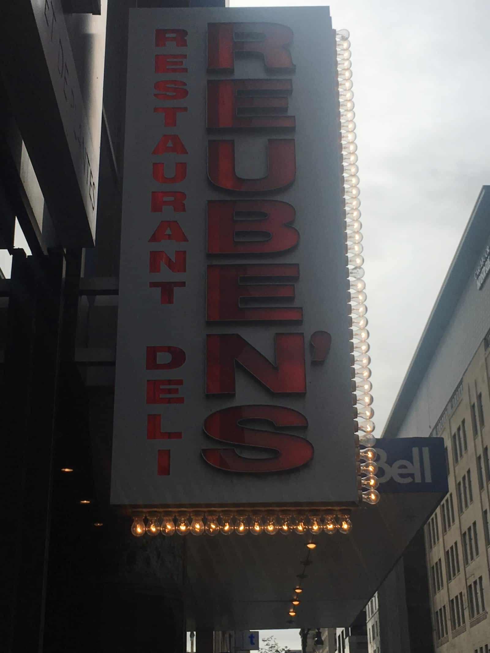 Notre marque de commerce! Un savoureux sandwich un pain pumpernickel tranché épais garni dune hauteur dune demi-livre de viande fumée, fromage suisse fondant, choucroute et la sauce secrète de Reubens. MD. 16.99